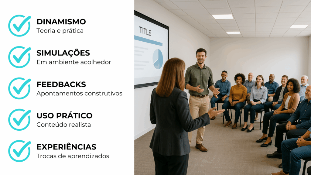 Programa feito sob medida para a sua empresa: tempo, conteúdo, exercícios e exemplos adaptados à realidade da equipe, dos clientes e da cultura interna. Treinamento com aplicações em reuniões, vendas e apresentações estratégicas.